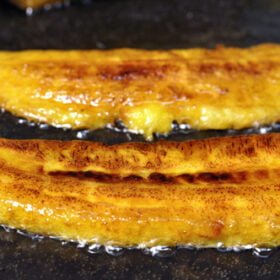 - Fry the plantains for about 2-3 minutes on each side, or until they are golden brown and caramelized.