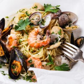 - Serve the shrimp, clams, and scallops pasta in individual bowls, garnished with chopped parsley.