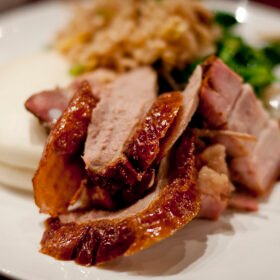- To serve, carve the duck into thin slices and serve with the pancakes, hoisin sauce, cucumbers, and scallions for wrapping.