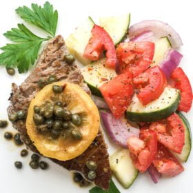 - Transfer the tuna steaks onto individual serving plates and top with a “melted” lemon slice and a spoonful of the lemon-caper sauce and serve immediately with your favorite sides. Enjoy!