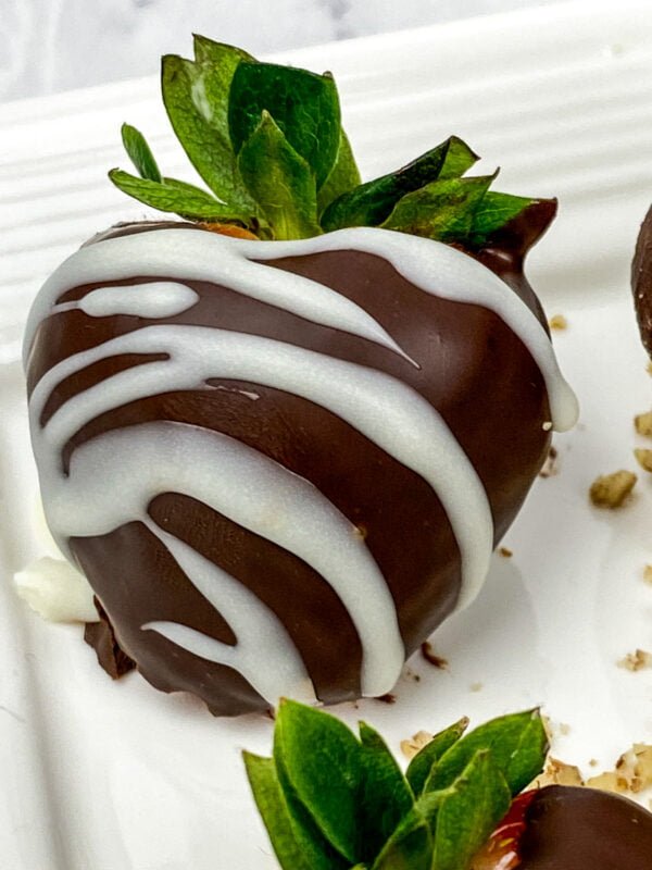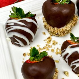 - Dip the bottom of remaining strawberries in the melted white chocolate and then dip into the bowl of chopped pecans. Swirl until the bottom of each strawberry is completely coated in the nuts. Transfer to the baking sheet with the other strawberries and return to refrigerator until set, approximately 20 minutes.