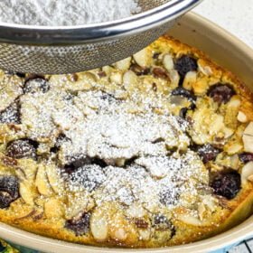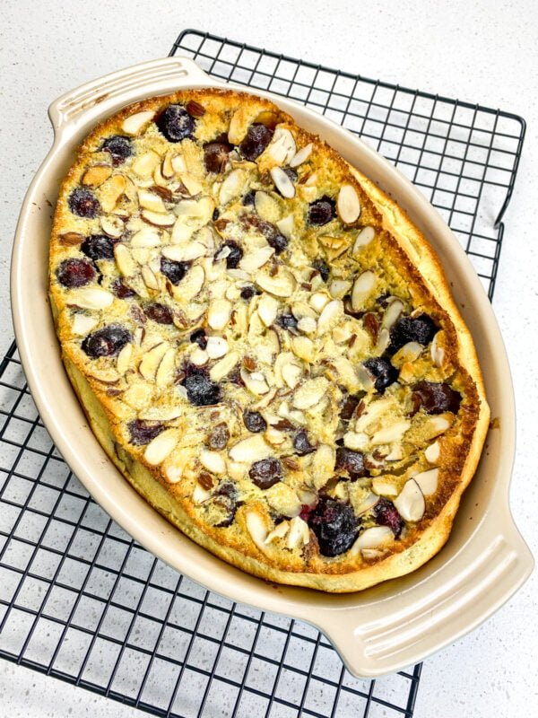It’s tough to beat the incredible taste of fresh cherries in season, so it’s no surprise they are the customary choice for this classic French dessert. Traditionally, the pits were left in the cherries so they could infuse the dish with a light almond-like flavor while it bakes. However, contemporary versions mostly feature pitted fresh cherries, instead. This version uses almond extract and slivered almonds to achieve a similar flavor profile to the original version.