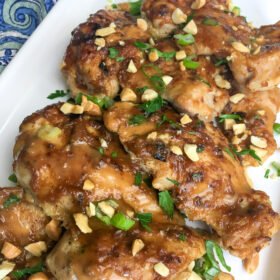 - Remove chicken and transfer to a serving tray. Garnish with chopped fresh cilantro, chopped peanuts, and green onions, if desired. Serve immediately with extra peanut sauce and your favorite sides. Enjoy!