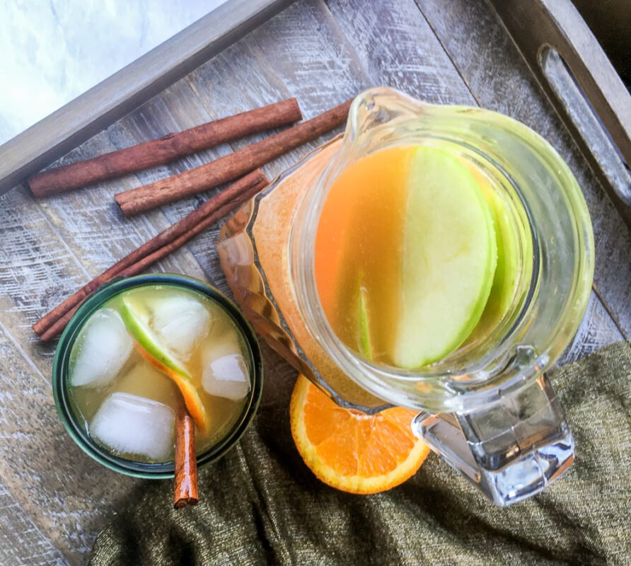 - Add the apple juice, sparkling water, ground ginger, orange slices, and apple slices to a large pitcher or punch bowl and stir to combine.