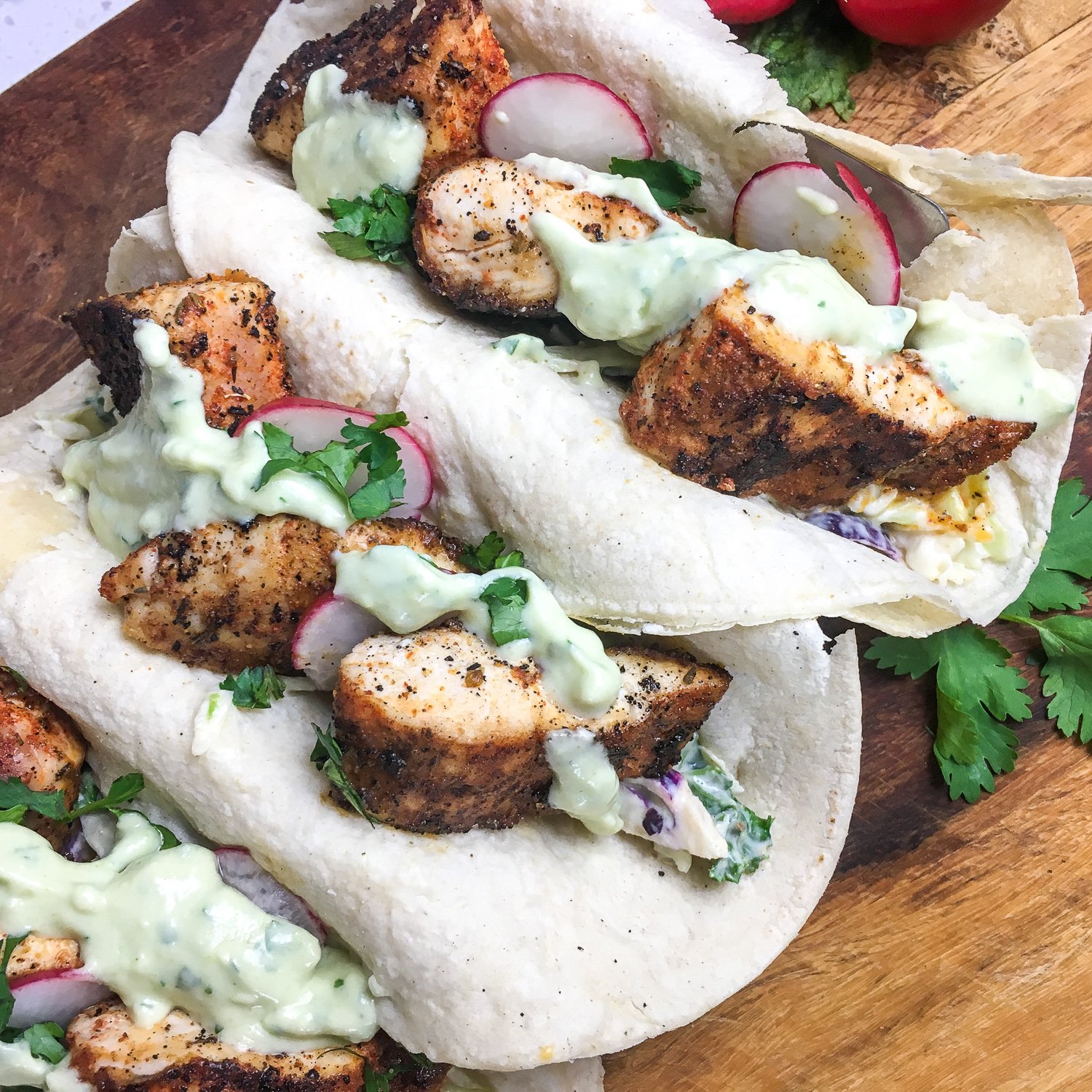 - To serve, evenly divide the creamy coleslaw and blackened fish between the 8 tortillas. Top with the sliced radishes and fresh cilantro leaves. If desired, drizzle some Creamy Avocado Sauce on top. Enjoy!