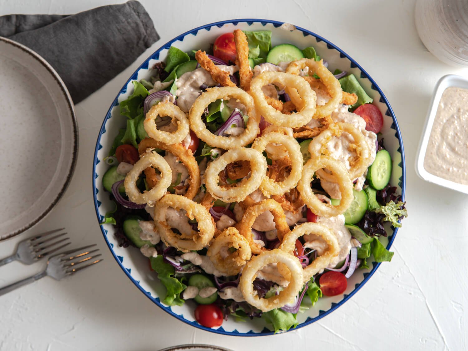- Add calamari rings, a few at a time to the flour mixture. Toss gently to coat. Shake off excess coating and test oil temperature by placing a corner of one ring into oil. If it sizzles, it is hot enough and you can add a few rings at a time to the hot oil. Do not over crowd oil or it will cool down too much and make your calamari greasy instead of crispy. Cook 1 – 3 minutes or until just lightly golden. Do not over cook.