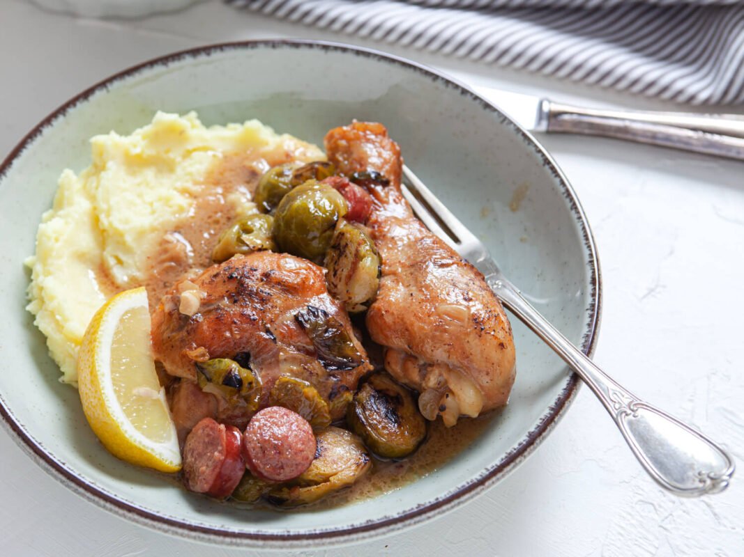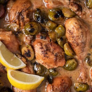 - Ten minutes before the chicken is finished cooking, add the brussels sprouts to the chicken. Add lemon juice and continue cooking 10 minutes to until chicken has is cooked through.