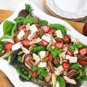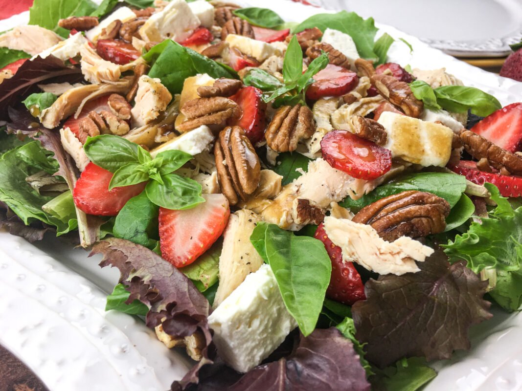 - Arrange mixed salad greens on a platter and top with the shredded chicken, sliced strawberries, Feta cheese, and pecans. Drizzle the balsamic dressing on top and serve immediately. Enjoy!
