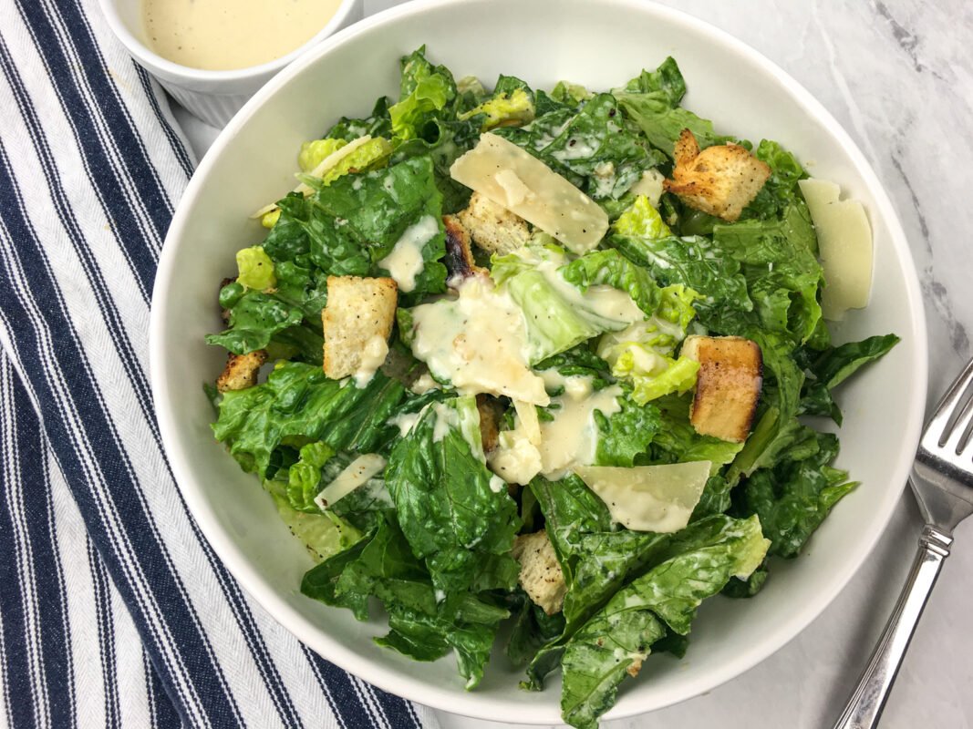• When ready to serve, assemble the salad by adding the chopped Romaine lettuce to a large mixing bowl. Add the toasted croutons and shaved Parmesan and drizzle with 1/3 cup of dressing. Gently toss to combine.
