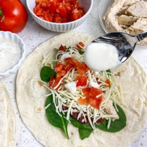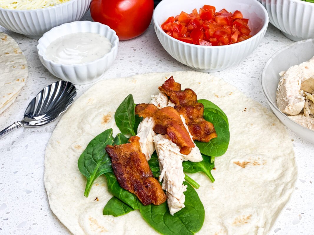 - Place the tortilla wraps on a clean work surface and divide the spinach, chicken, and bacon between them. Top each tortilla with the shredded Mozzarella cheese and chopped tomatoes. Lightly season with salt and black pepper, if desired.
