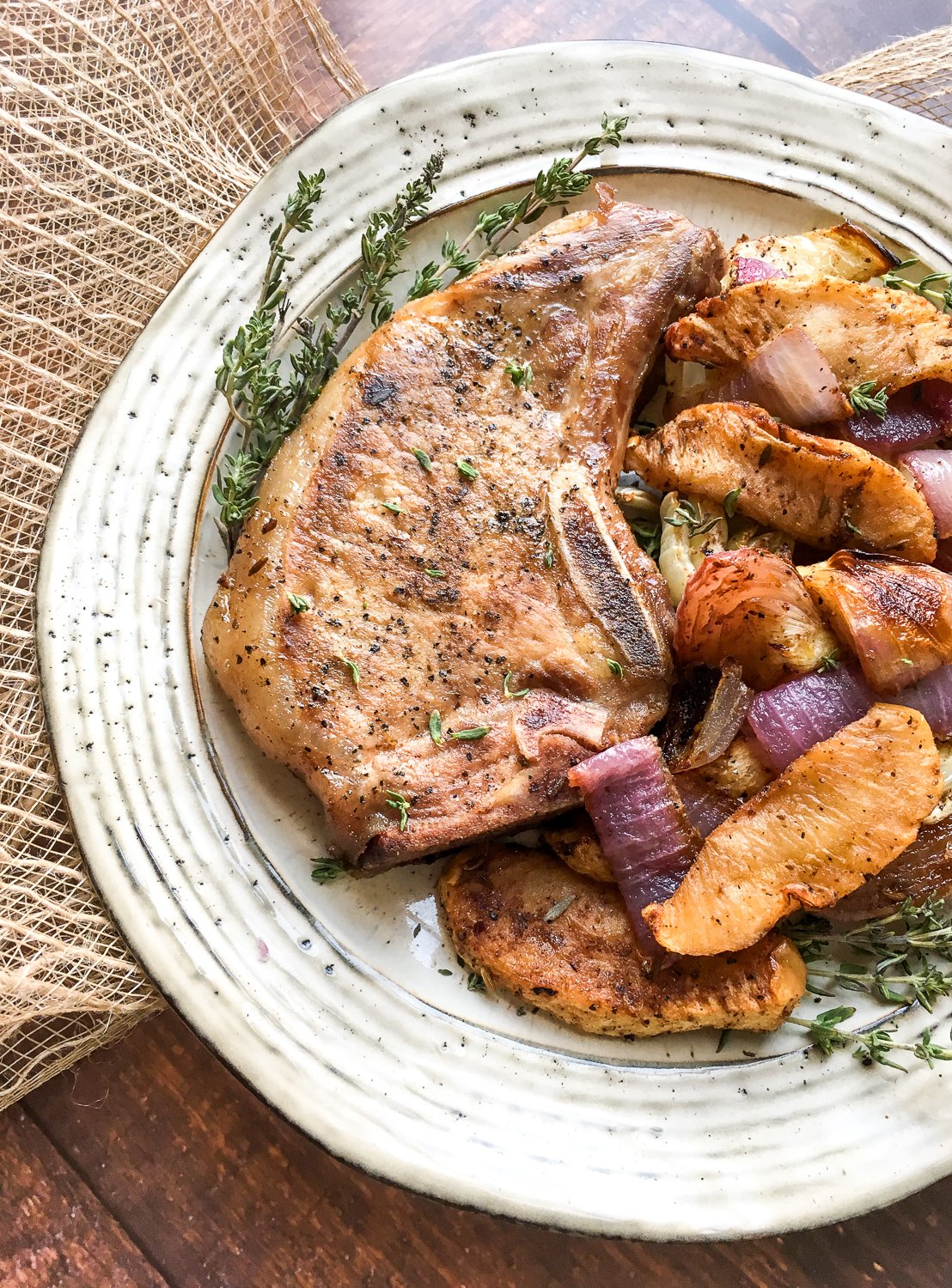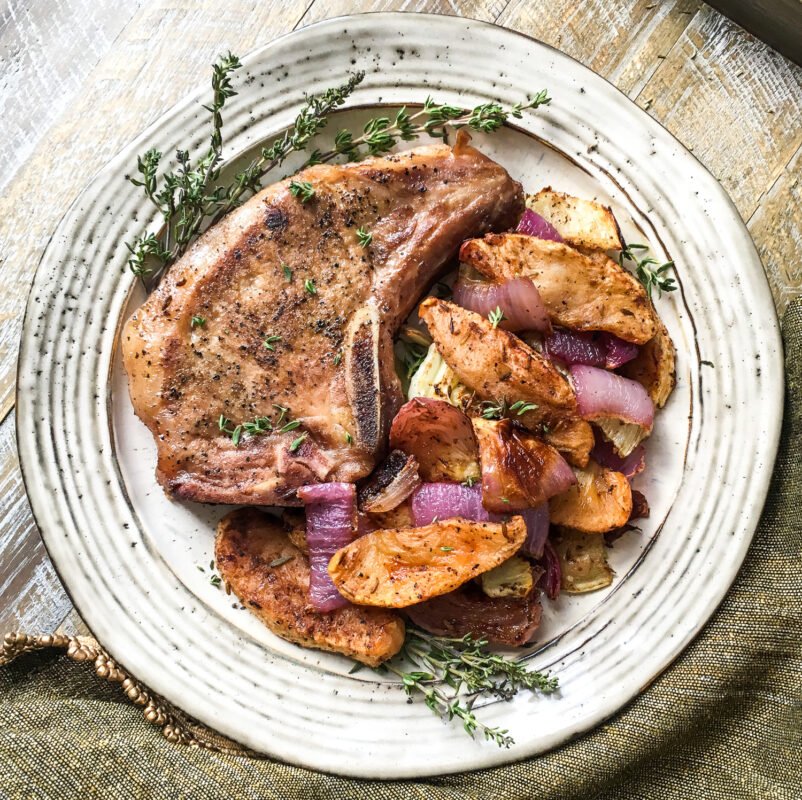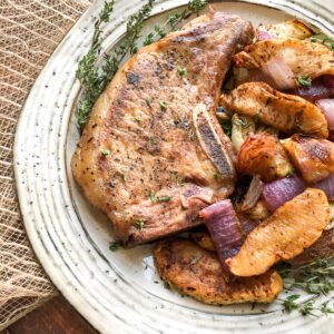 Sous Vide Bone-In Pork Chops with Roasted Apples, Fennel, & Red Onion