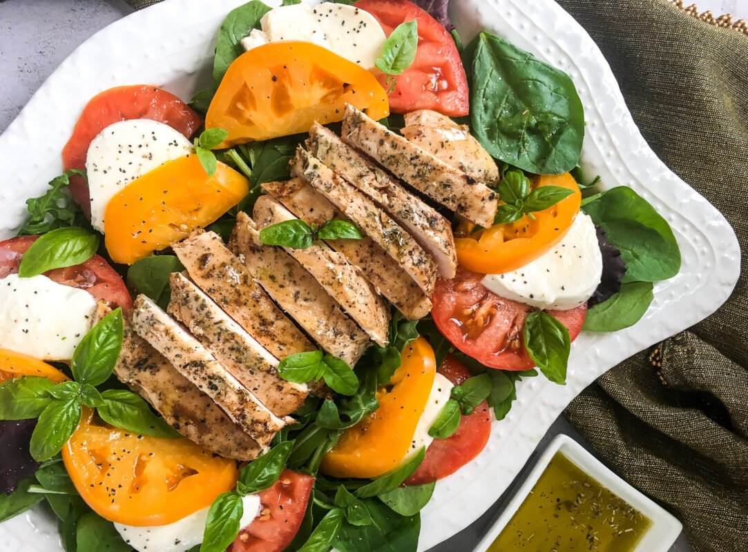 - Remove from heat and rest for 5 minutes before slicing and placing one sliced breast on top of each salad. Garnish each salad with some fresh basil sprigs and season with salt and black pepper, to taste.