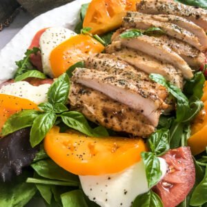 - When the chicken is almost done, prep the salad by dividing the mixed salad greens, heirloom tomato slices, and fresh Mozzarella between individual serving plates.
