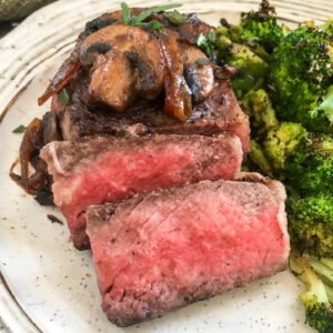 - Remove from heat and rest for 5 minutes before serving with the caramelized onions and mushrooms, and your choice of sides.* Enjoy!