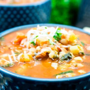 - Stir in the chopped spinach and parsley. Simmer just until the spinach wilts, approximately 1-2 minutes. Remove from heat and discard the bay leaves and remaining cheese rind. Serve immediately sprinkled with freshly grated Parmesan cheese, if desired. Enjoy!
