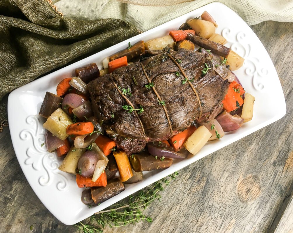- Nestle the shallots and carrots around the beef and tuck in the fresh thyme sprigs. Add the beef broth and place in the pre-heated oven to roast until the beef reads between 125°F-130°F* for medium-rare on an instant read thermometer, approximately 35-40 minutes. (The temperature will rise another 5-10 degrees while resting).