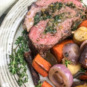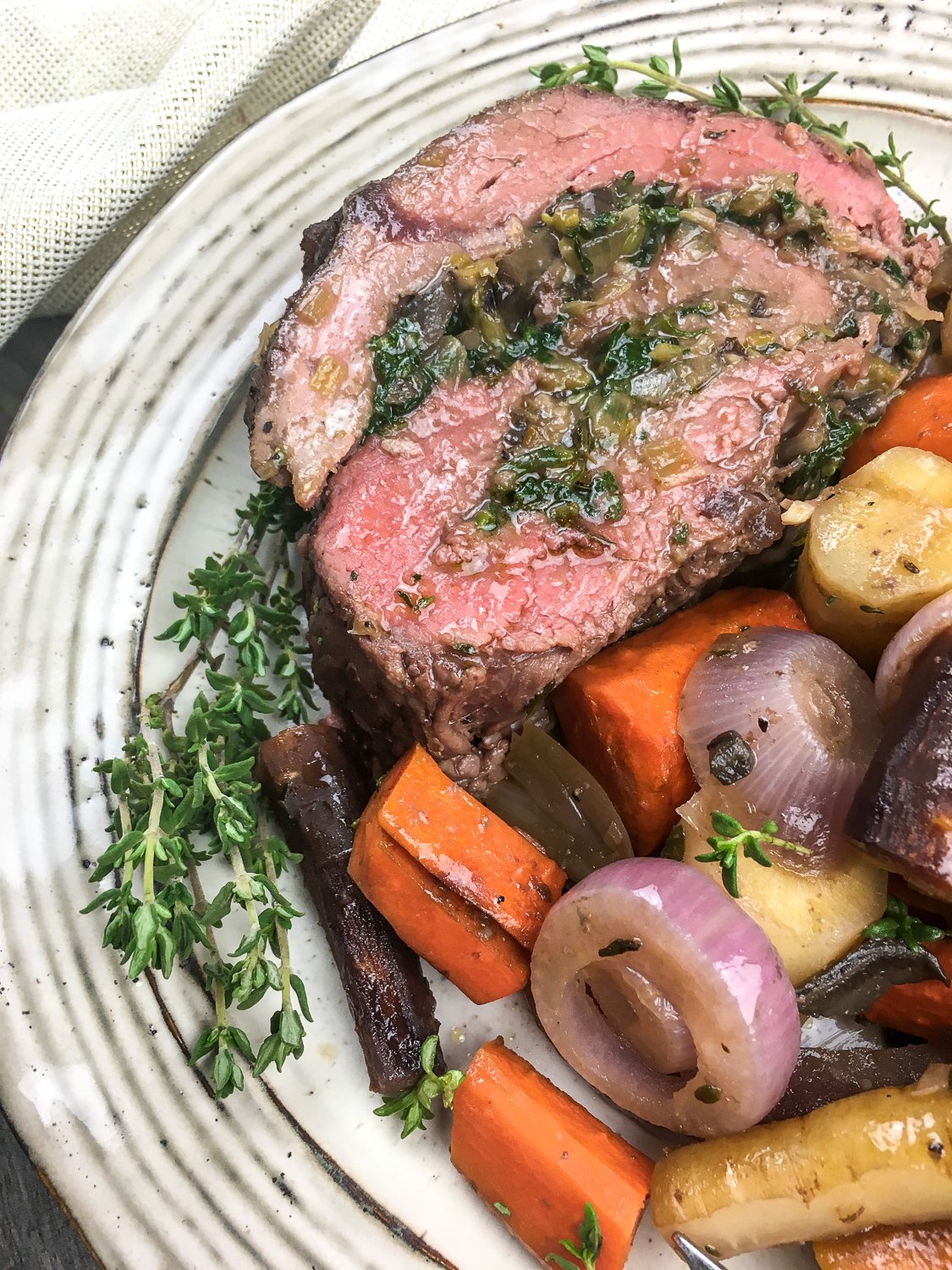 - Carve the stuffed tenderloin and serve immediately with the roasted vegetables and pan sauce. Enjoy!