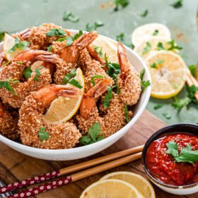 - Rinse shrimp under cold running water and lightly pat dry. A small amount of moisture will help the coating stick to the shrimp.