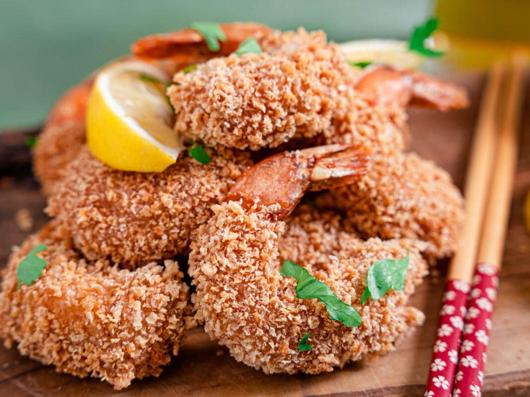 - Working in batches and with no more than 8-10 shrimp at a time, fry the panko shrimp until nicely golden-brown, approximately 1 minute per batch. Transfer shrimp to a paper towel-lined plate to drain the excess oil. Continue frying until all the shrimp are done.