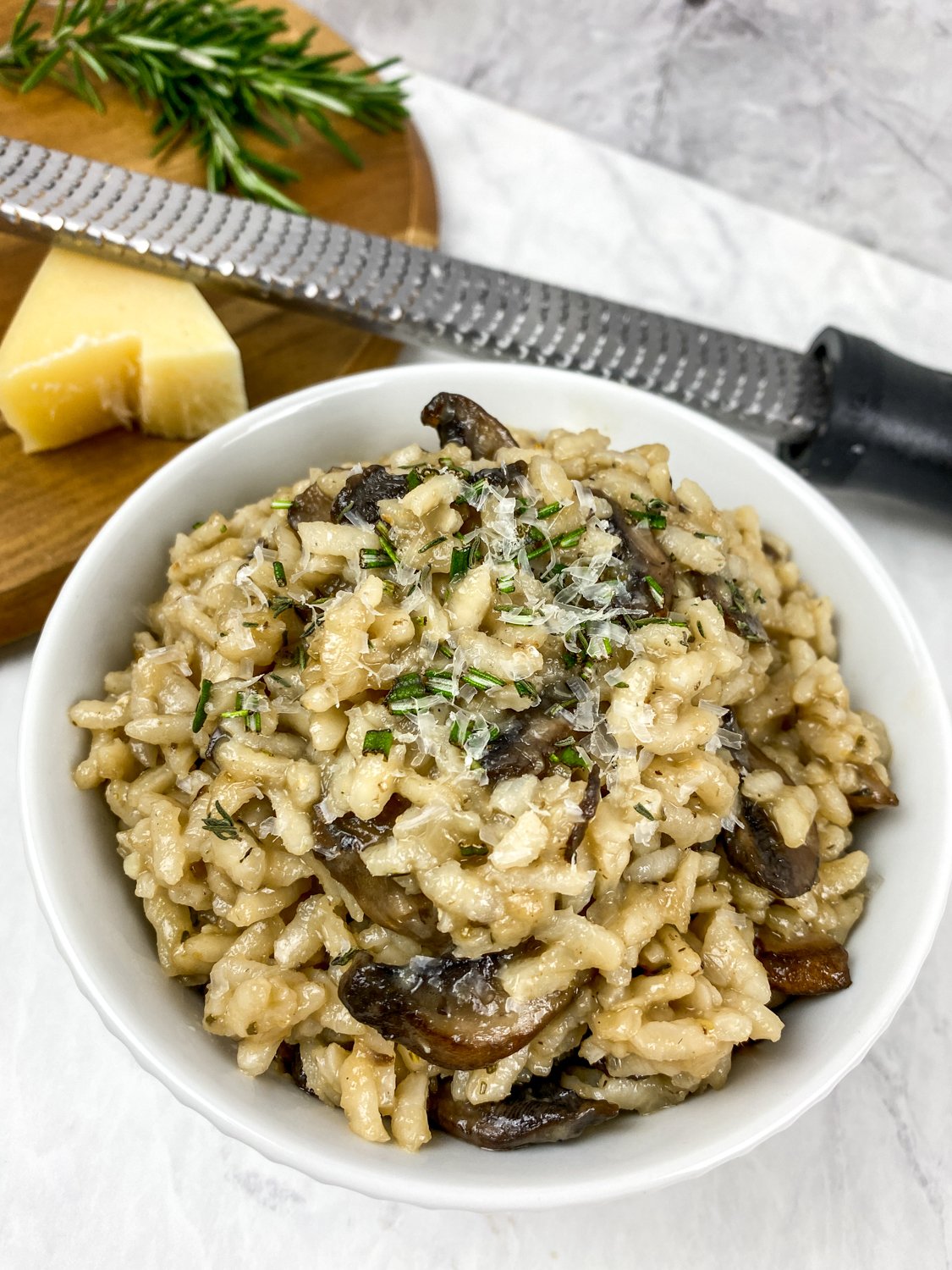 - Remove from heat and stir in the freshly grated Parmesan cheese and fresh rosemary. Add mushrooms and stir until thoroughly combined. Season with salt and black pepper, to taste.