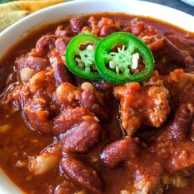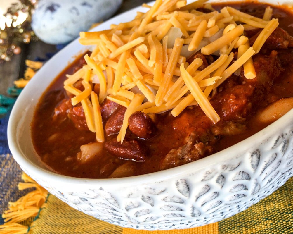 - To serve, spoon chili into individual serving bowls and top with shredded cheese, chopped onions, and/or sliced jalapeno peppers, as desired. Enjoy!