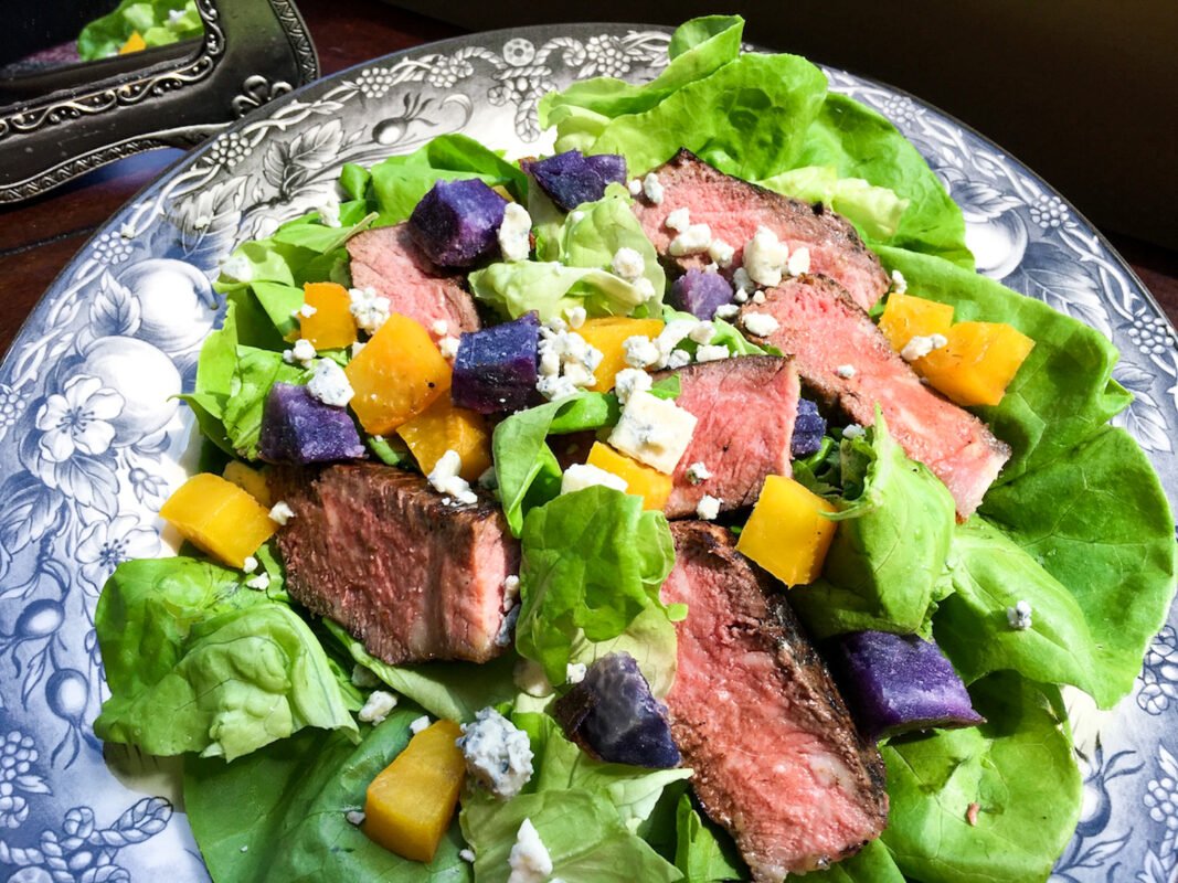 - To assemble the salad, divide the Bibb lettuce between 4 serving plates and add one-quarter of the roasted beets, potatoes, and blue cheese to each plate. Add the sliced steak and drizzle with the creamy blue cheese dressing. Serve immediately with the remaining dressing on the side, along with some sea salt and fresh cracked black pepper. Enjoy!