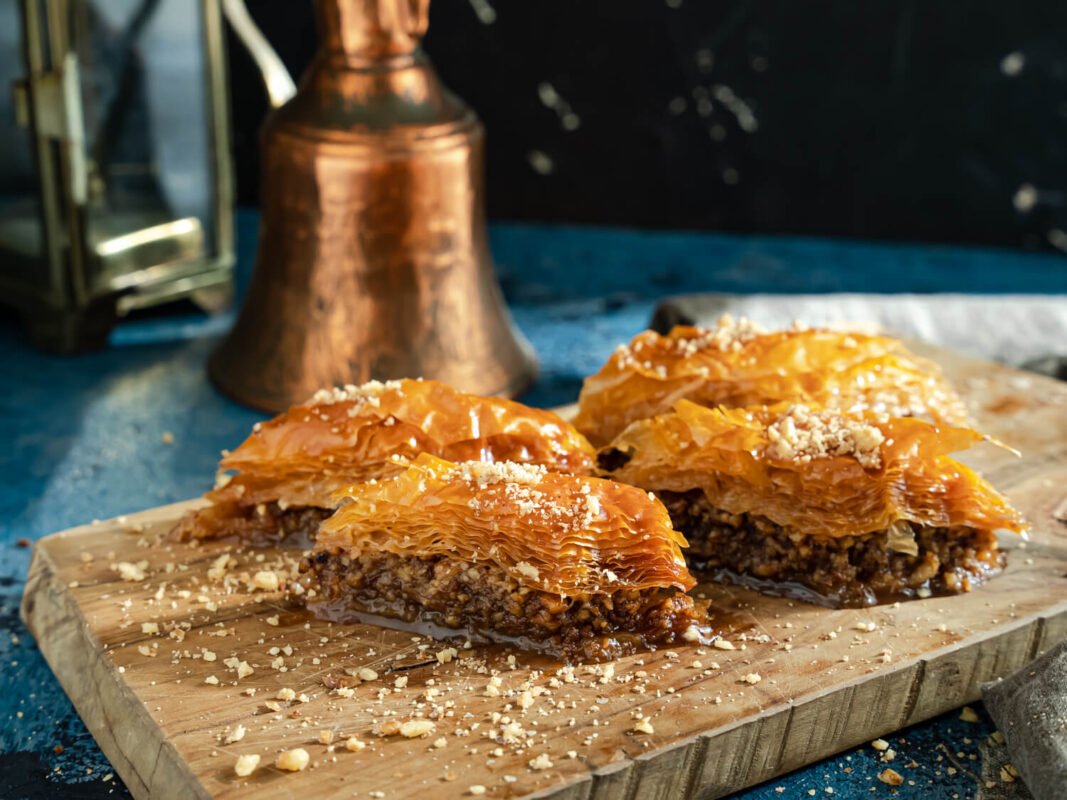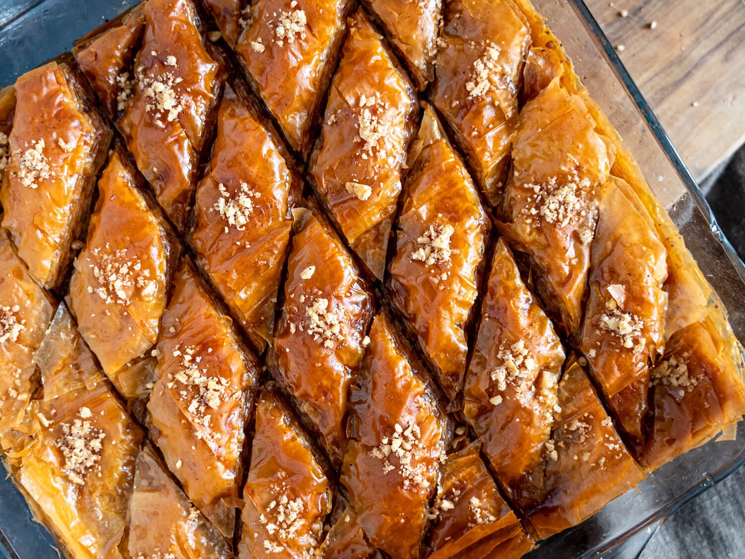 - Place baklava in refrigerator for at least 15 minutes to chill for even slicing. Remove the baklava from refrigerator and slice the baklava into 4 vertical long strips. Next, make 10 or 11 diagonal cuts to create the traditional diamond-shaped slices.