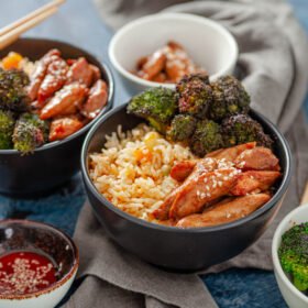 - When ready to serve add rice mixture to deep serving bowls.