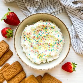 - Fold in the confetti sprinkles and transfer the dip to a serving bowl.