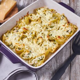 - Bake pasta shells uncovered until golden-brown and bubbly, 20-25 minutes. Let cool 5 minutes, then serve and enjoy!