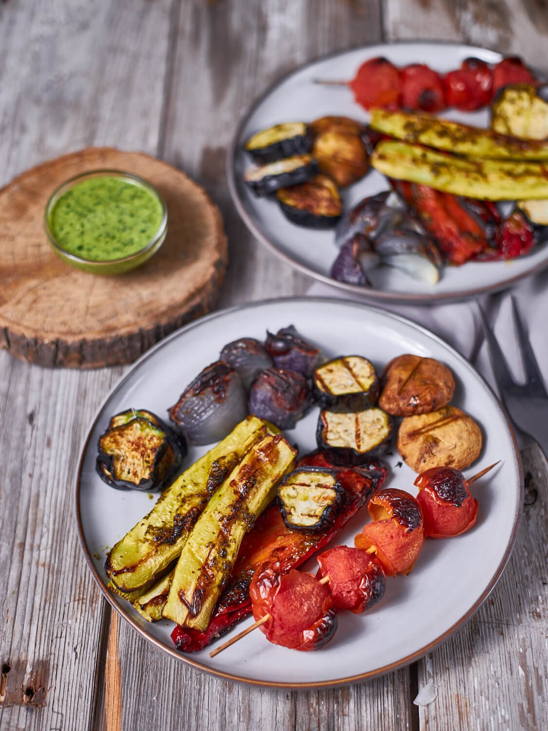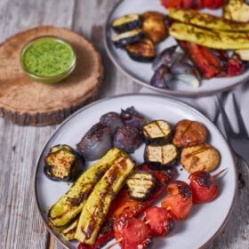 - Add the vegetables to a shallow dish and drizzle with half of the herb marinade. Reserve the remaining marinade for serving.