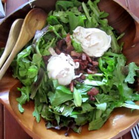 - Divide the salad among four plates. Top each salad with a quarter of the crispy lardons, a quarter of the croutons, and a quarter of the sliced boiled eggs. Serve immediately.