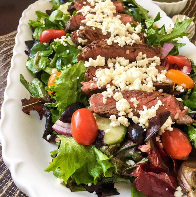 - Once the steak is rested, slice into thin strips and place on top of the salad. Top with crumbled Feta cheese and serve immediately with the remaining balsamic dressing on the side. Enjoy!
