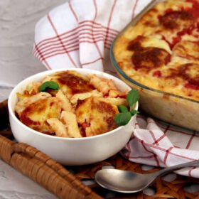 - While oven is preheating, heat a large pot of lightly salted water over high heat and prepare the pasta according to package directions, cooking 1-2 minutes less than al dente. (Pasta will continue to cook during baking).