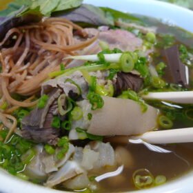 - Ladle the hot broth over the noodles and meat, and top with sliced onions, bean sprouts, chili oil, scallions, and herbs.