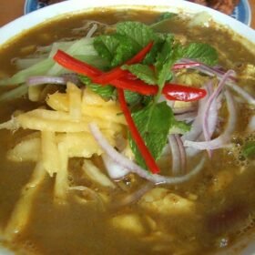 - Serve the soup with cooked rice noodles, shredded cucumber, sliced red onion, chopped mint leaves and laksa leaves. Enjoy!