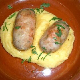 Sausages and polenta is a delicious dish that combines savory sausages with creamy polenta. The sausages are typically cooked until they’re tender and juicy, and then served on a bed of polenta made from cornmeal. The polenta adds a comforting, rich texture that complements the flavor of the sausages.