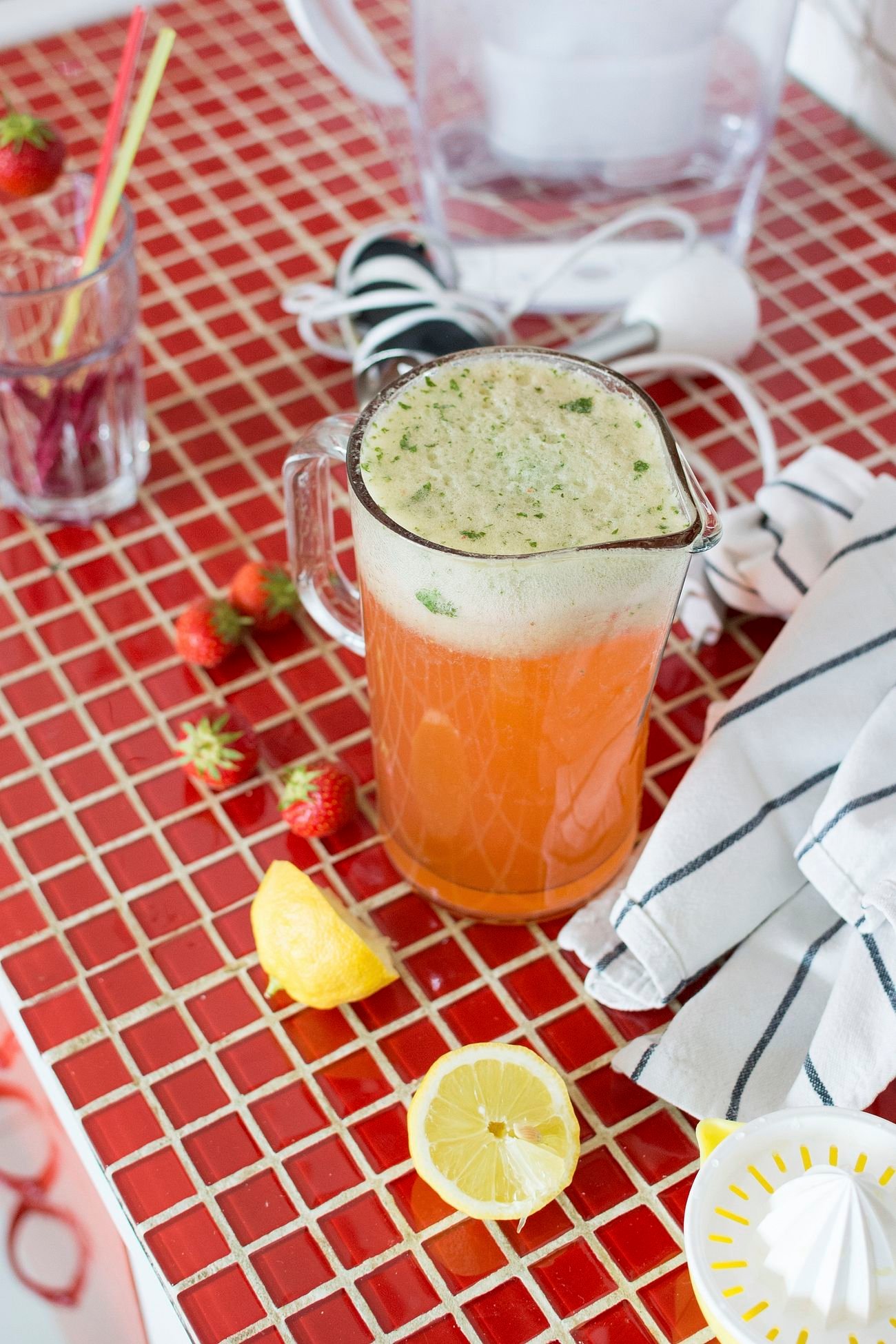 - In a large pitcher, combine the strawberry puree, freshly squeezed lemon juice, and chopped basil leaves.