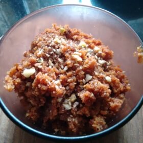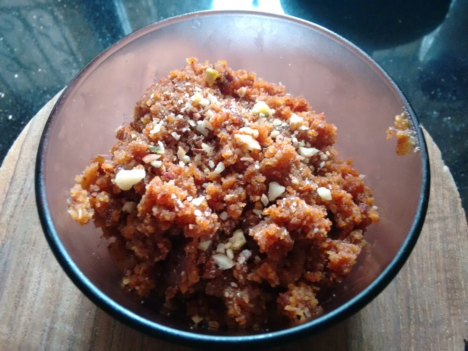 - Remove the pan from the heat and garnish the halwa with chopped nuts of your choice. You can lightly toast the nuts beforehand for extra flavor.