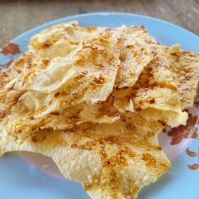 - Carefully place the flattened cassava mixture into the heated oil. Fry for about 2-3 minutes on each side, or until the crackers turn golden brown and become crispy.