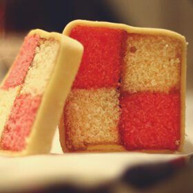 Battenberg cake is a delightful British classic which is a scrumptious sponge cake that is divided into four colorful sections, usually pink and yellow, all wrapped in a layer of marzipan.
