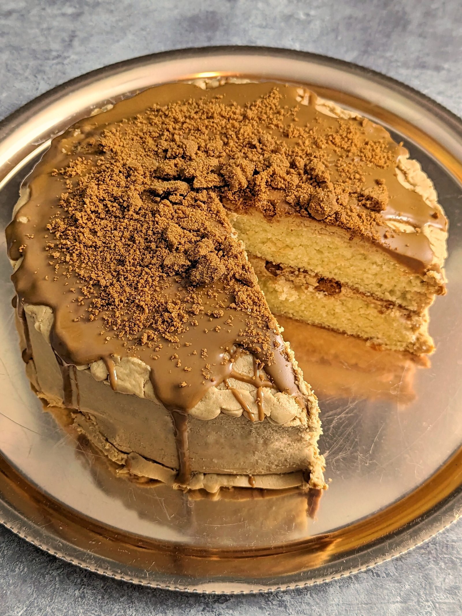 - If desired, top the cake with crushed Biscoff cookies or sprinkle Biscoff cookie crumbs over the frosting for an extra touch.