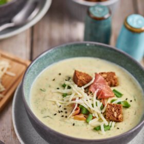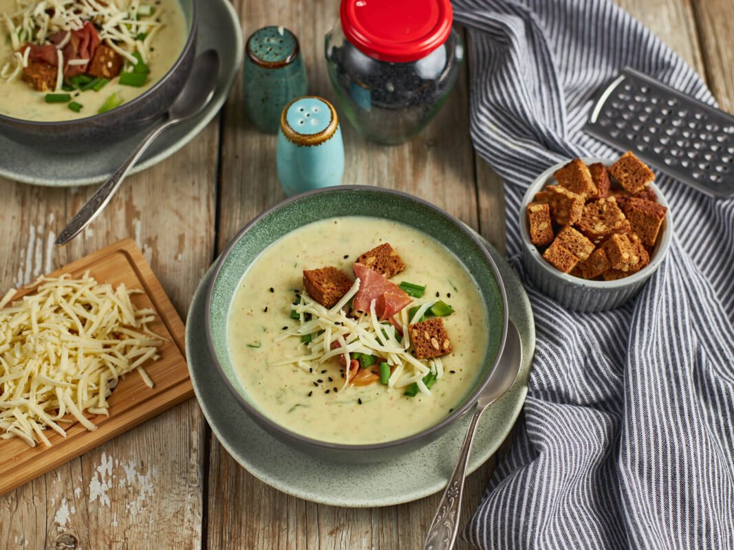 - Ladle into serving bowls and garnish with shredded cheese, croutons, sesame seeds, chives, and bacon.