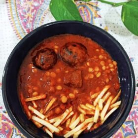 - Serve the Gheymeh stew hot with your choice of toppings, such as fried potatoes, dried lime powder, or saffron-infused rice.