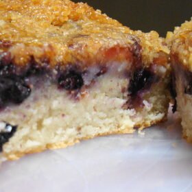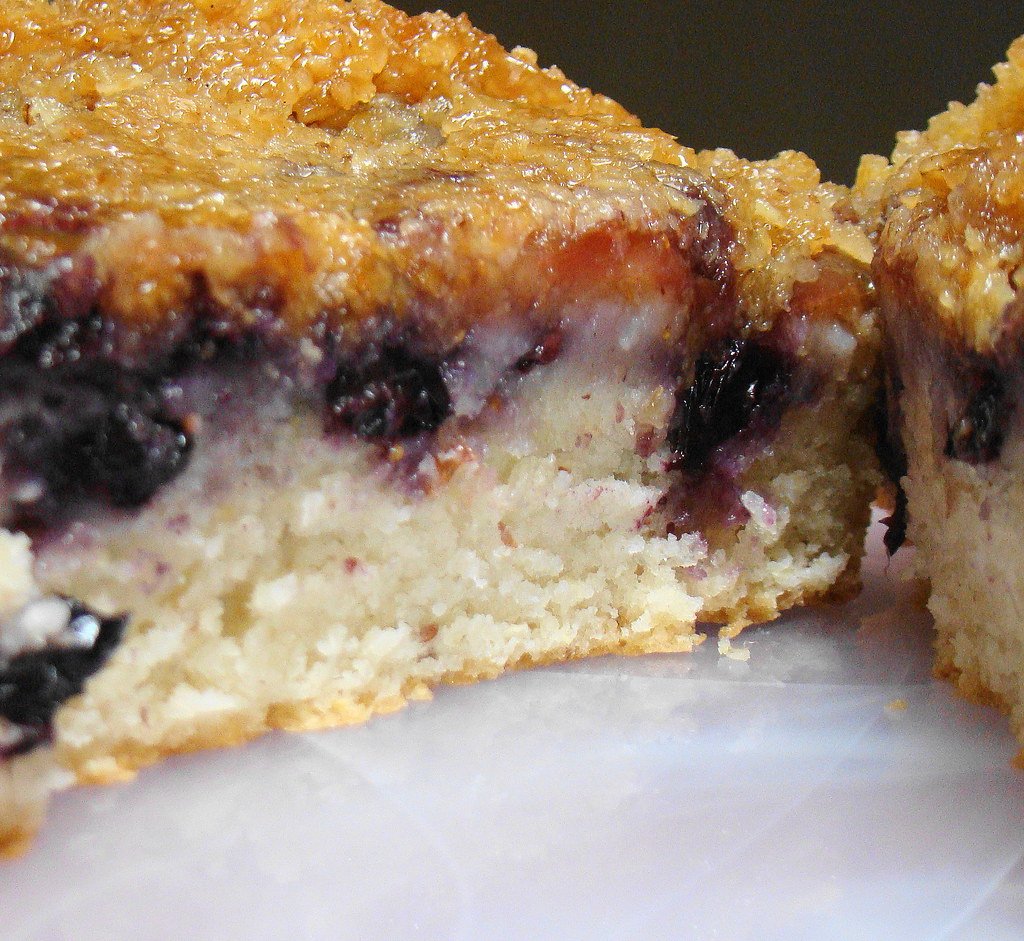- Spread half of the cake batter into the prepared baking dish. Top with the blueberry and fig filling. Spread the remaining batter over the filling.