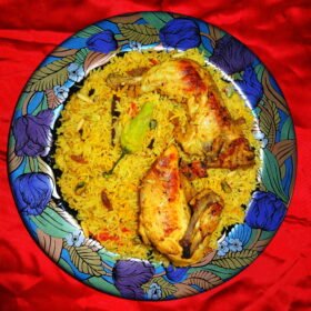 - Drizzle the saffron water over the rice and chicken, along with a few tablespoons of ghee or vegetable oil.