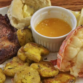 - Serve the sliced steak, shrimp, and lobster tails together on a platter. Garnish with freshly chopped parsley.