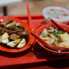 - Once the pork is tender, remove the pot from heat and assemble the dish. Place a portion of the cooked flat rice noodles in a bowl, ladle the braised pork, intestines, tofu, and some broth over the noodles.