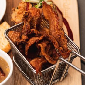 - Carefully place the coated pork jowl strips into the hot oil, frying them in batches for about 3-4 minutes or until golden and crispy.