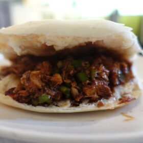 - Stuff the shredded pork belly inside the bread rolls, dividing it evenly among the four rolls.